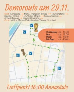 Infos zur Demoroute:Start: Annasäule → Maria-Theresien-Straße → Triumphpforte → Salurner-Straße → Brunecker Straße → Museumstraße → Angerzellgasse → Universitätsstraße →Ende: Ni Una Menos Platz (Landes-Theater-Vorplatz)