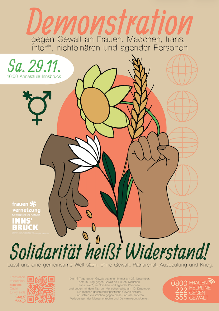 Lasst uns eine gemeinsame Welt säen, ohne Gewalt, Patriarchat, Ausbeutung und Krieg. Demonstration gegen Gewalt an Frauen, Mädchen, trans, inter*, nichtbinären und Agenden Personen