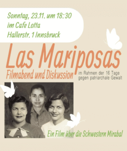 Sonntag 23.11.2025 | 18:30 | Café Lotta, Hallerstraße 1 Innsbruck weitere Infos: @cafelotta_ibk Die Mirabal-Schwestern organisierten den Kampf gegen die Trujillo-Diktatur in der Dominikanischen Republik
